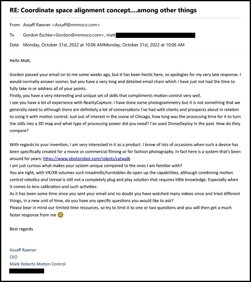 “Based on the description of your patent, it appears that your technology could indeed be a valuable addition to the capabilities of Mark Roberts Motion Control (MRMC) and Dimension Studios.”